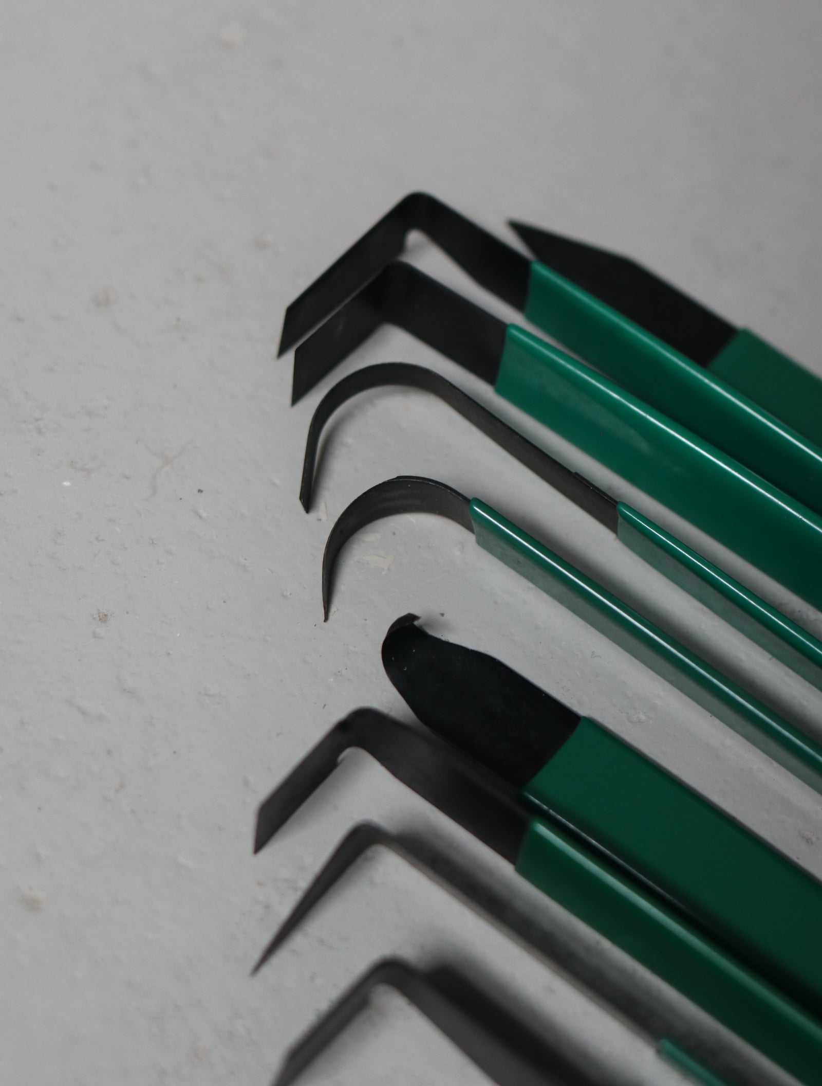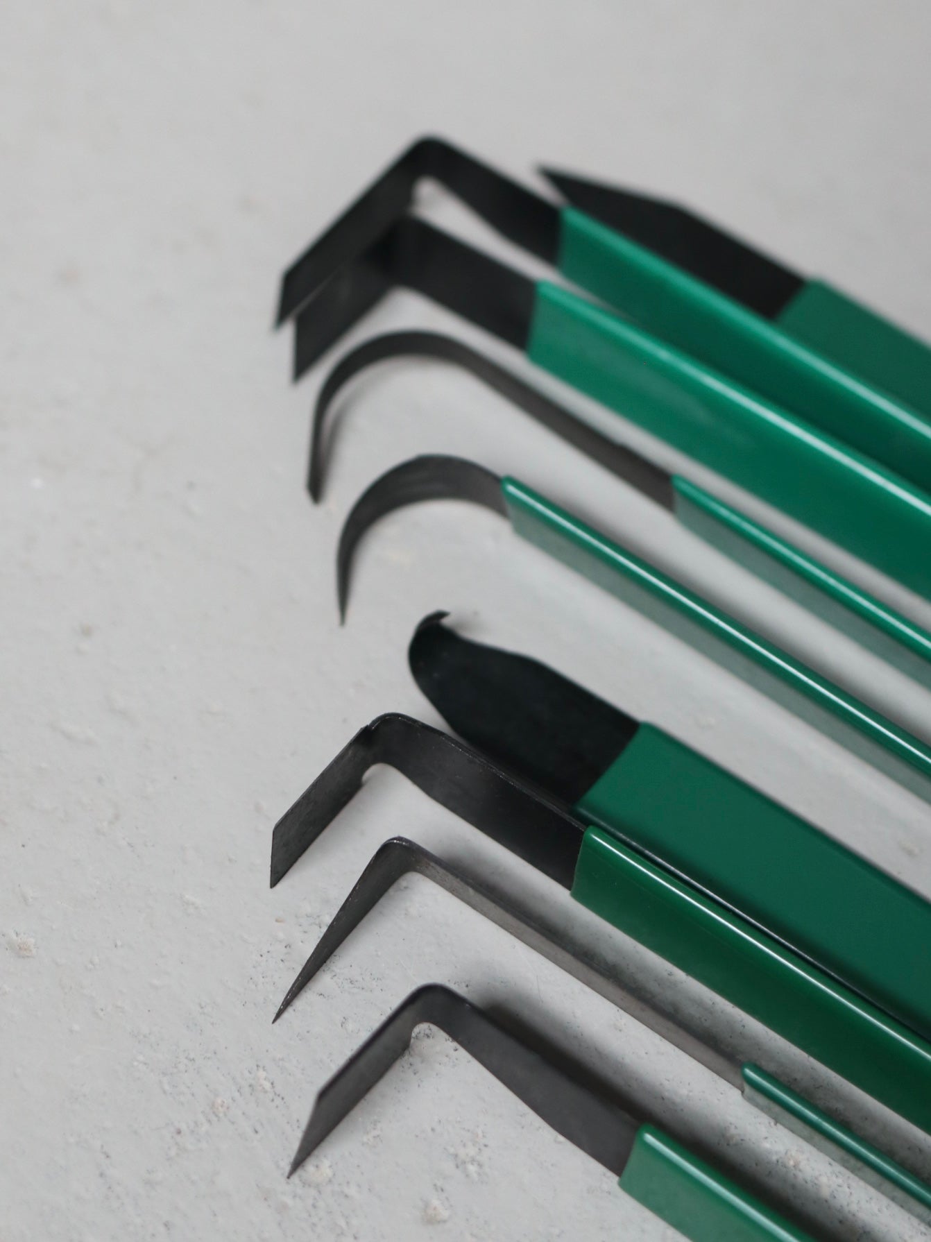 Set of 9 hand tools for trimming thrown pottery. Made of metal with comfortable and nice green rubber handles for a secure and stable grip. Made in Taiwan